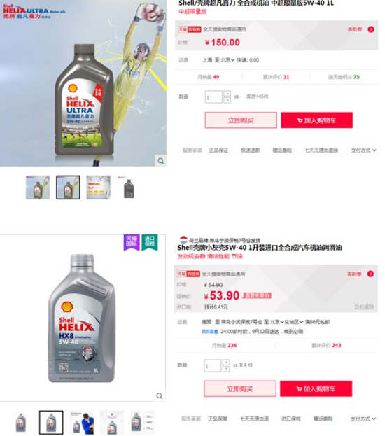 这就不难解释为何天猫壳牌官方旗舰店公开打脸天猫国际了。对于如此悬殊的价位,配上壳牌的公开声明指责,不禁让天猫国际的货源蒙上一层迷雾。一个平台两套说辞,消费者又该相信谁?